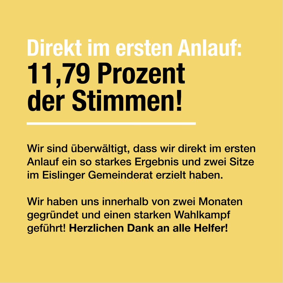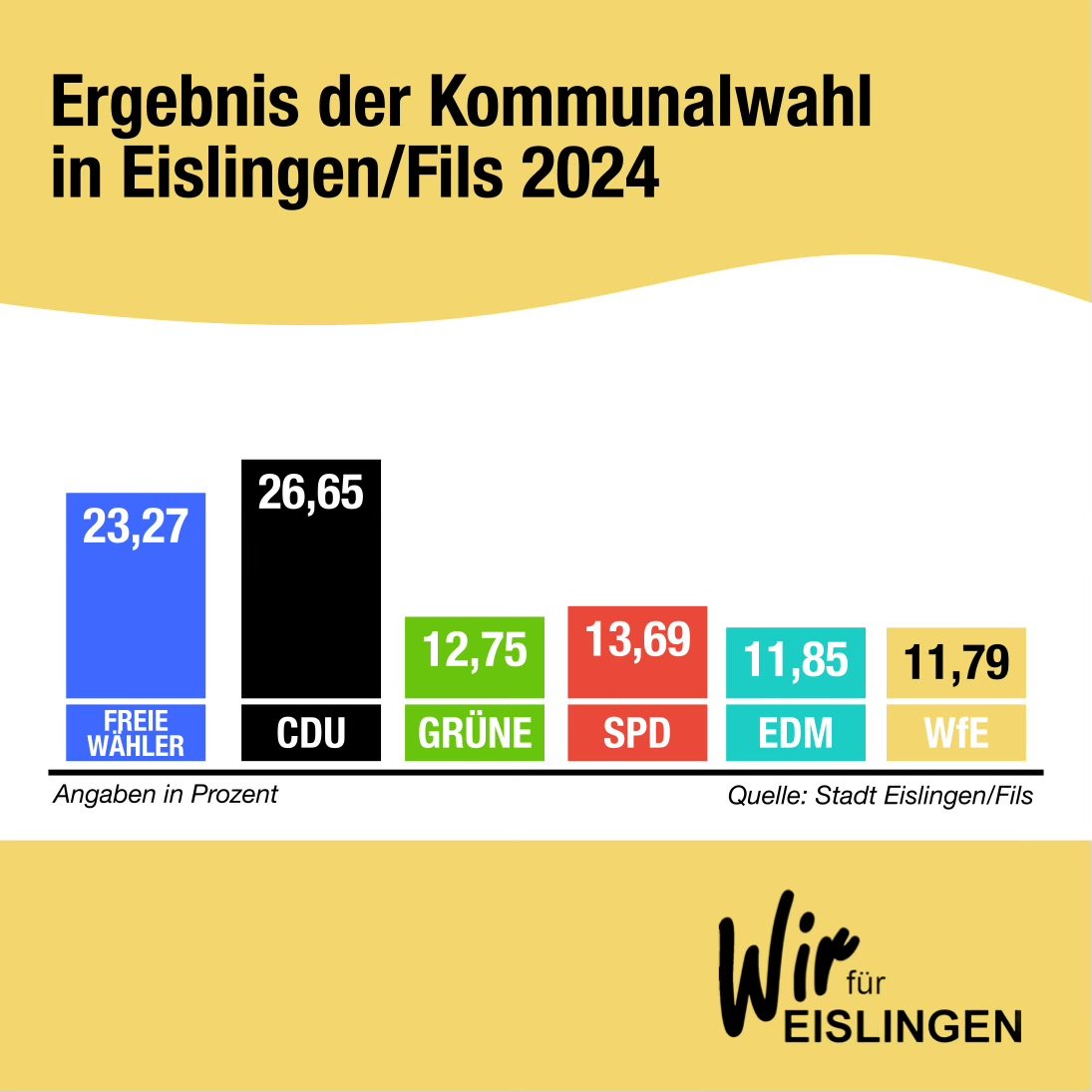 Direkt im ersten Anlauf hat WfE es auf 11,79 Prozent der Wählerstimmen der wahlberechtigten Bürgerinnen und Bürger der Stadt Eislingen/Fils geschafft! Dies stellt einen klaren Erfolg dar und sichert damit die Wählervernigung WfE langfristig als politische Kraft in Eislingen.